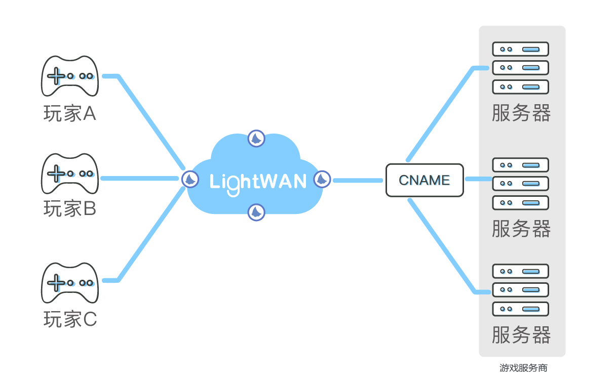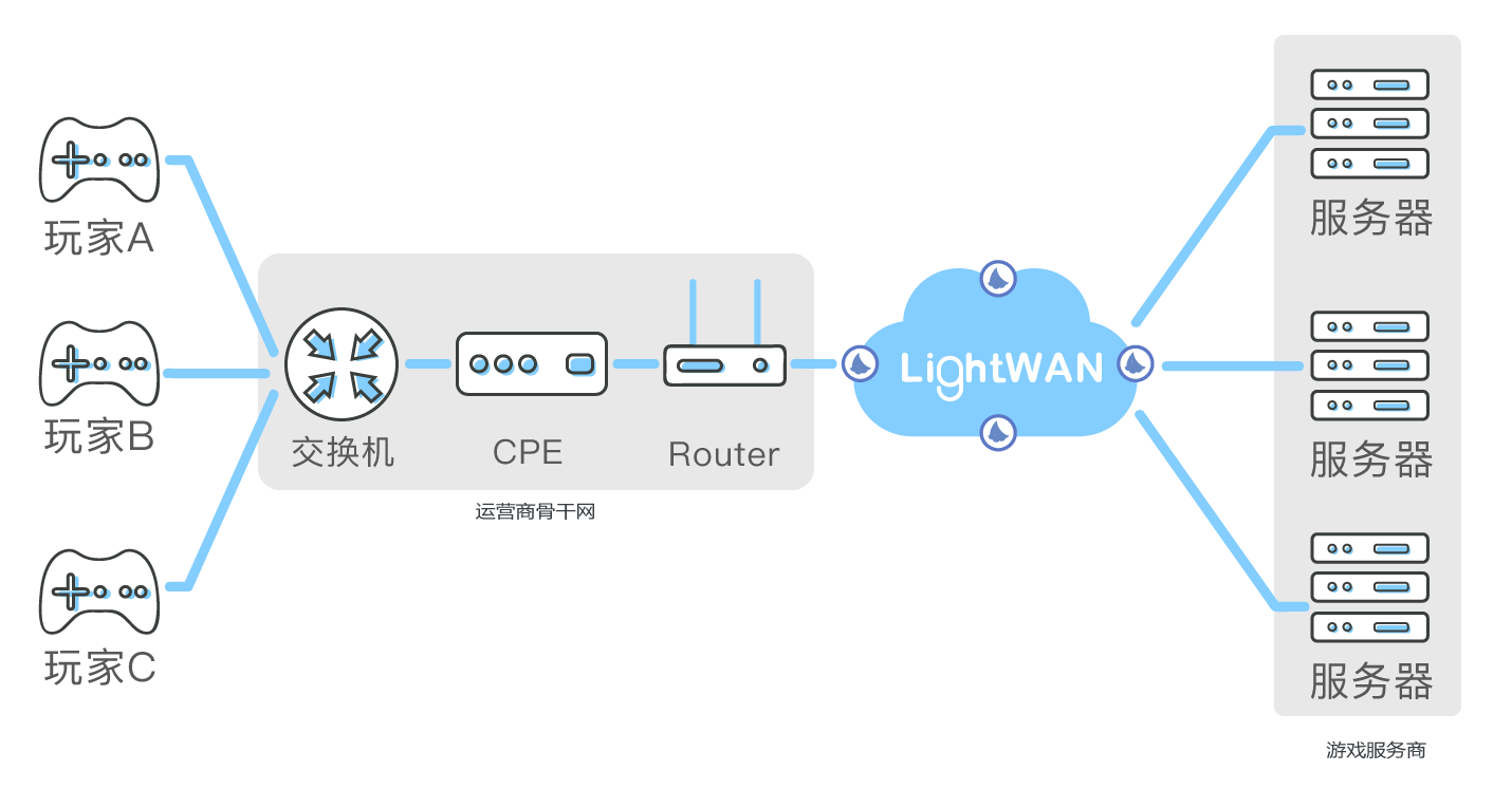 当玩家选择海外服务器时,无论是运营商还是游戏提供商只需将此游戏的流量送入 LightWAN 中,LightWAN 控制台会根据目标服务器所在位置,智能选择路由,提供链路,极大的提升玩家游戏体验。